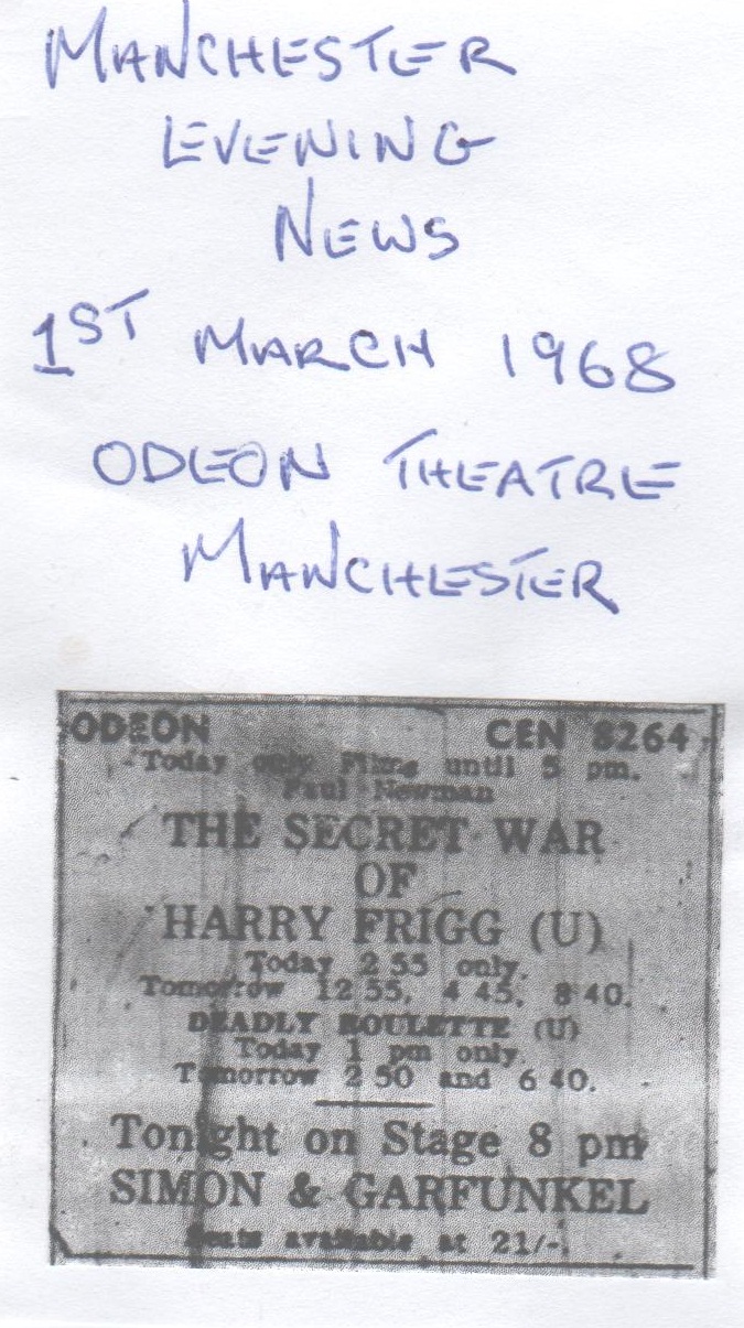 Having this page in my bookmark file, I thought I’d click on it for old time’s sake, to check for any updates there may be. It was I, “JayJay”, who filed the newspaper clipping shown above. As I stated in the note accompanying the clipping, the report on the Odeon concert was printed in the Manchester Evening News on the 2nd of March 1968. The article makes it clear that the concert took place the night before, which of course would make it the 1st of March. I have to say, it now being such a while ago, that I don’t hold much recollection of the night in question. I do, however, recall one of the duo (Simon, I believe it was) introducing the soon-to-be-released single “Mrs Robinson”, saying that it was from the soundtrack of an upcoming film.