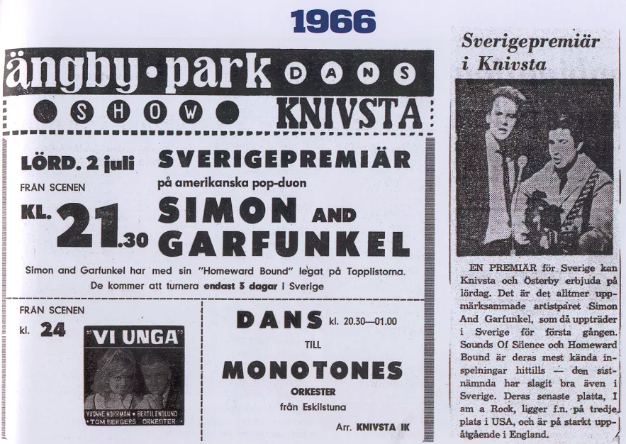 S & G did a 3 days tour of SwedenFirst date (premiere date) was on saturday, the 2nd of July 1966 at Ängby Park, Knivsta at 21.30.