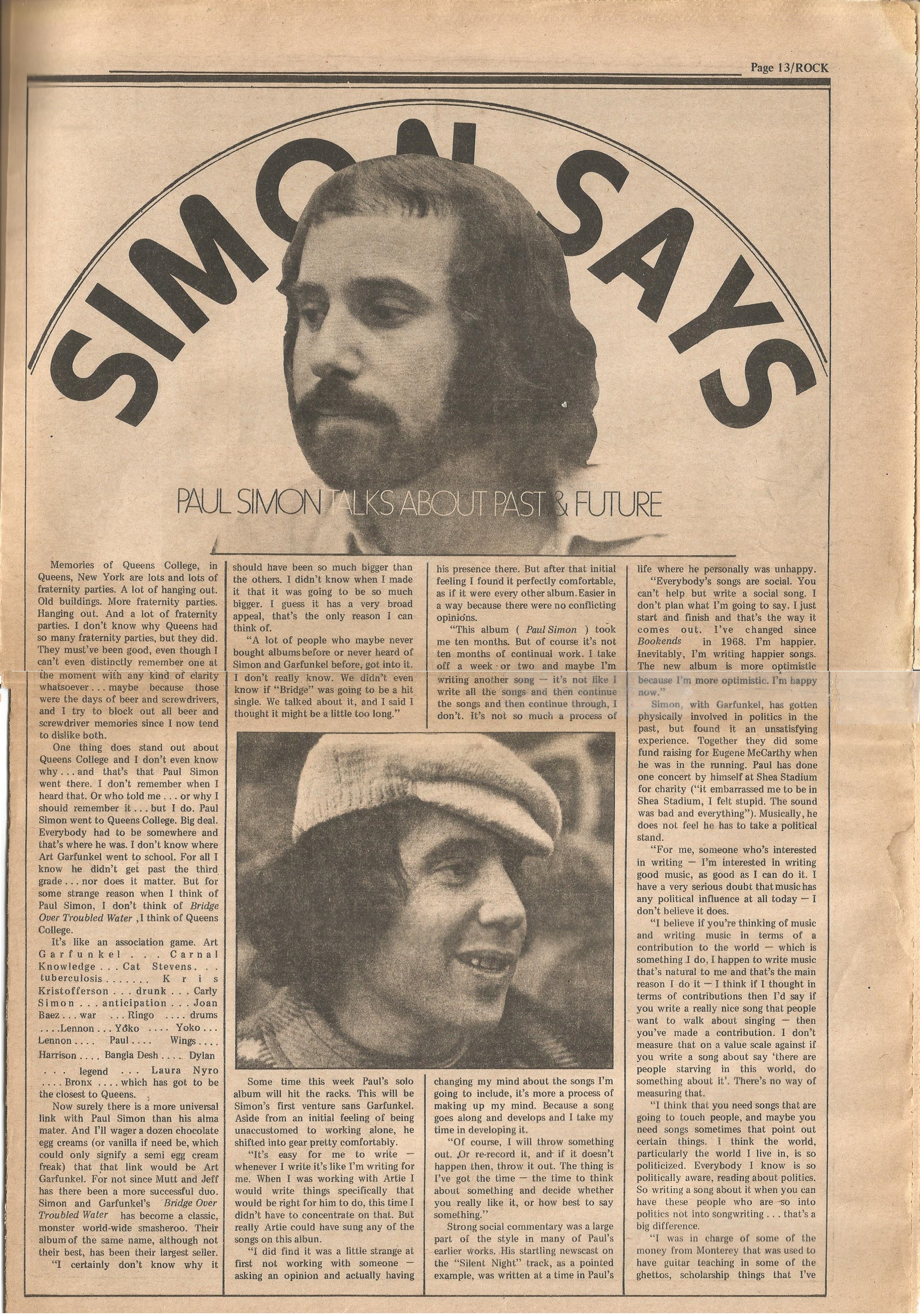 1972 Interview Paul Simon Talks: Past & Future [Rock Magazine Feb 14, 1972] Share this: Click to share on Facebook (Opens in new window) Facebook Click to share on X (Opens in new window) X Like Loading... Related