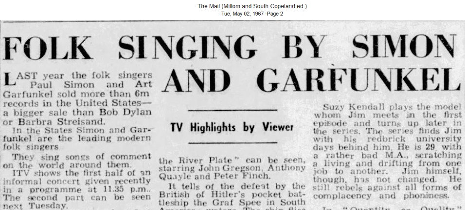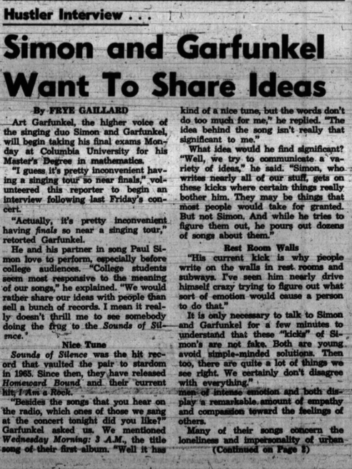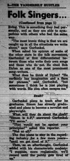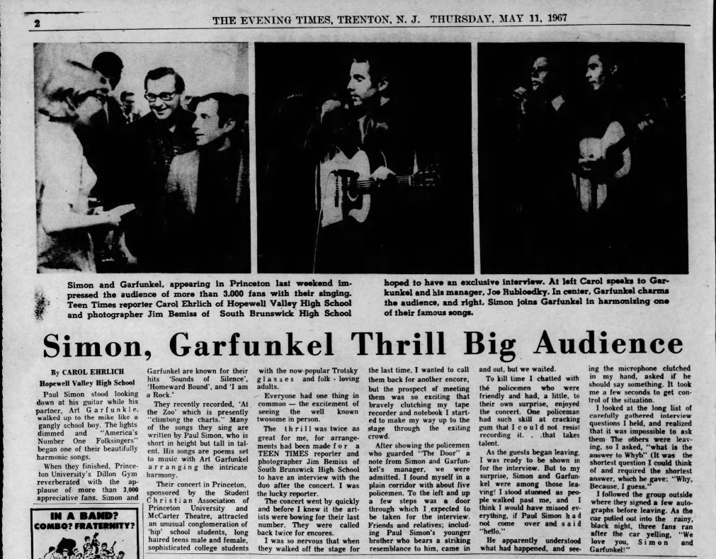 On May 5, 1967, Simon & Garfunkel played at Princeton University. In the May 11 review published in the Evening Times Trenton in new Jersey, according to the pictures Paul Simon was interviewed by Carol Ehrlich, but named Garfunkel. An almost memorable interview followed. And Joe Rubloedky his manager? Anyway, read for yourselves: