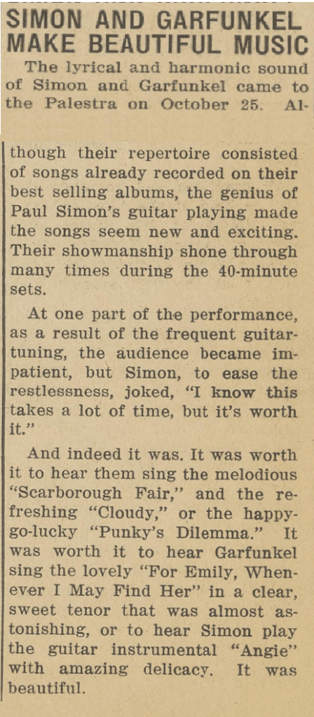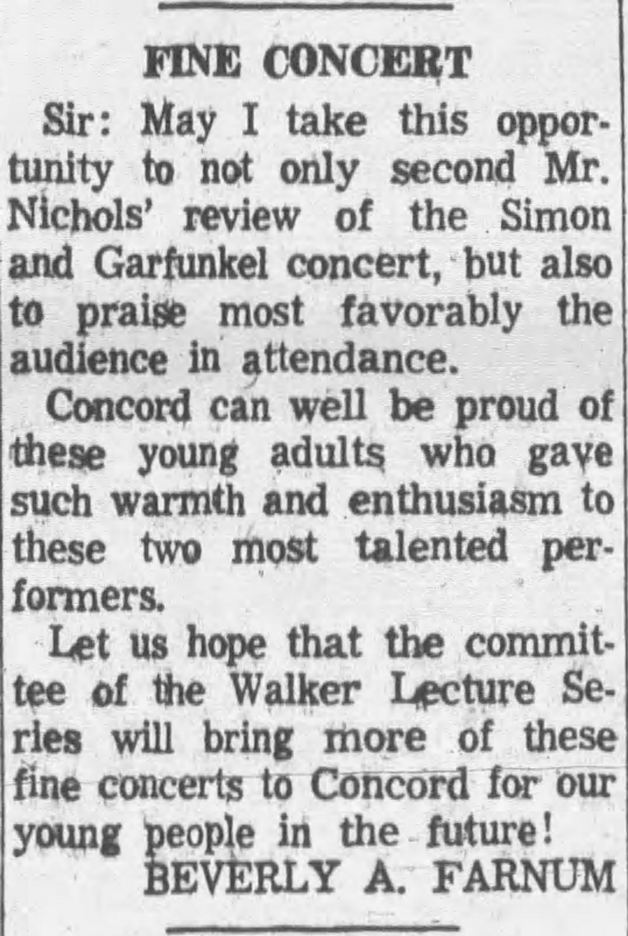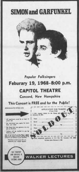 In a newspaper article (in Concord Monitor of 1977) I read that Simon and Garfunkel gave a free concert in Concord. Here’s a bit of that history.