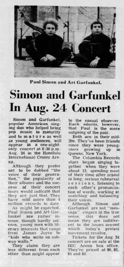 On August 24, 1968, Simon & Garfunkel played at the Honolulu International Center [HIC] Arena