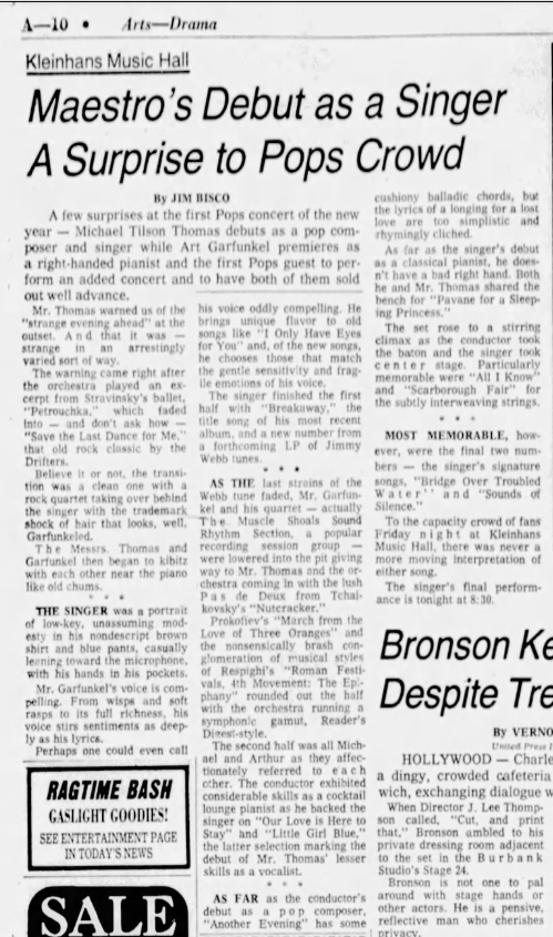In 1977 Art Grafunkel played with the Muscle Shoals Rhythm Sounds Section and the Buffalo Philharmonic Orchestra directed by Michael Tilson Thomas, during the Philharmonic Pops.