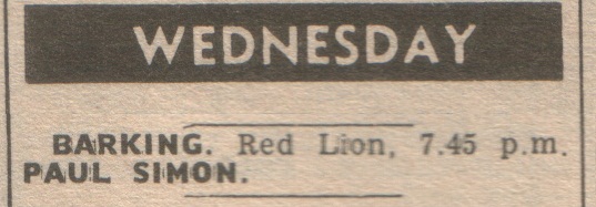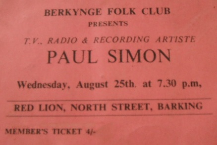 Paul Simon played a half hour set on the main stage at the beginning of the evening session on Saturday 31 July 1965, billed as Paul Simons*) Some dates mentioned are possibly not gigs where too Paul Simon had been invited. He live in and around Exeter , sang songs in various pubs to pay for his beer. The names are mentioned in a series of letters written to ‘This Is Exeter’ in late 2008.