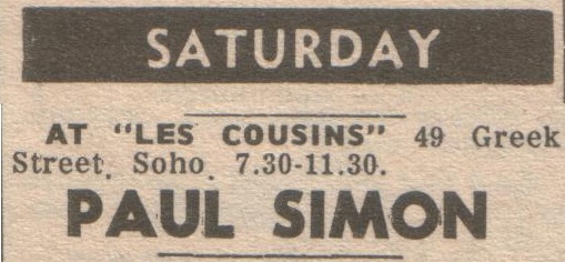 Comtemporary Folk. Paul Simon & Guests October 27th, 8 pm,. Opening Londons only Contemporary Folk Club ‘Leduce’. 22, D’Arblay St.1. GER 5096 (off Wardour St.)