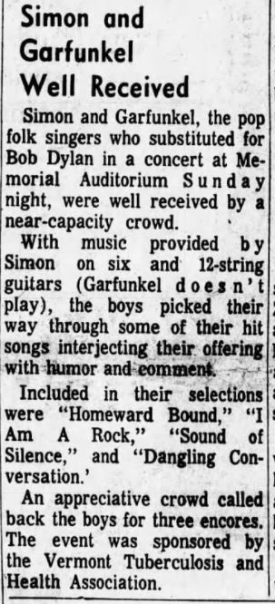 Simon & Garfunkel repleaced “The Lovin’ Spoonful” in Saint John. The show drew 3000 attendants and they sang “The sound of silence”, “A hazy shade of winter” and “a very pretty ballad-type piece “For Emily, when ever I may find her”. [source: Telegraph Journal, Jan 28, 1967].