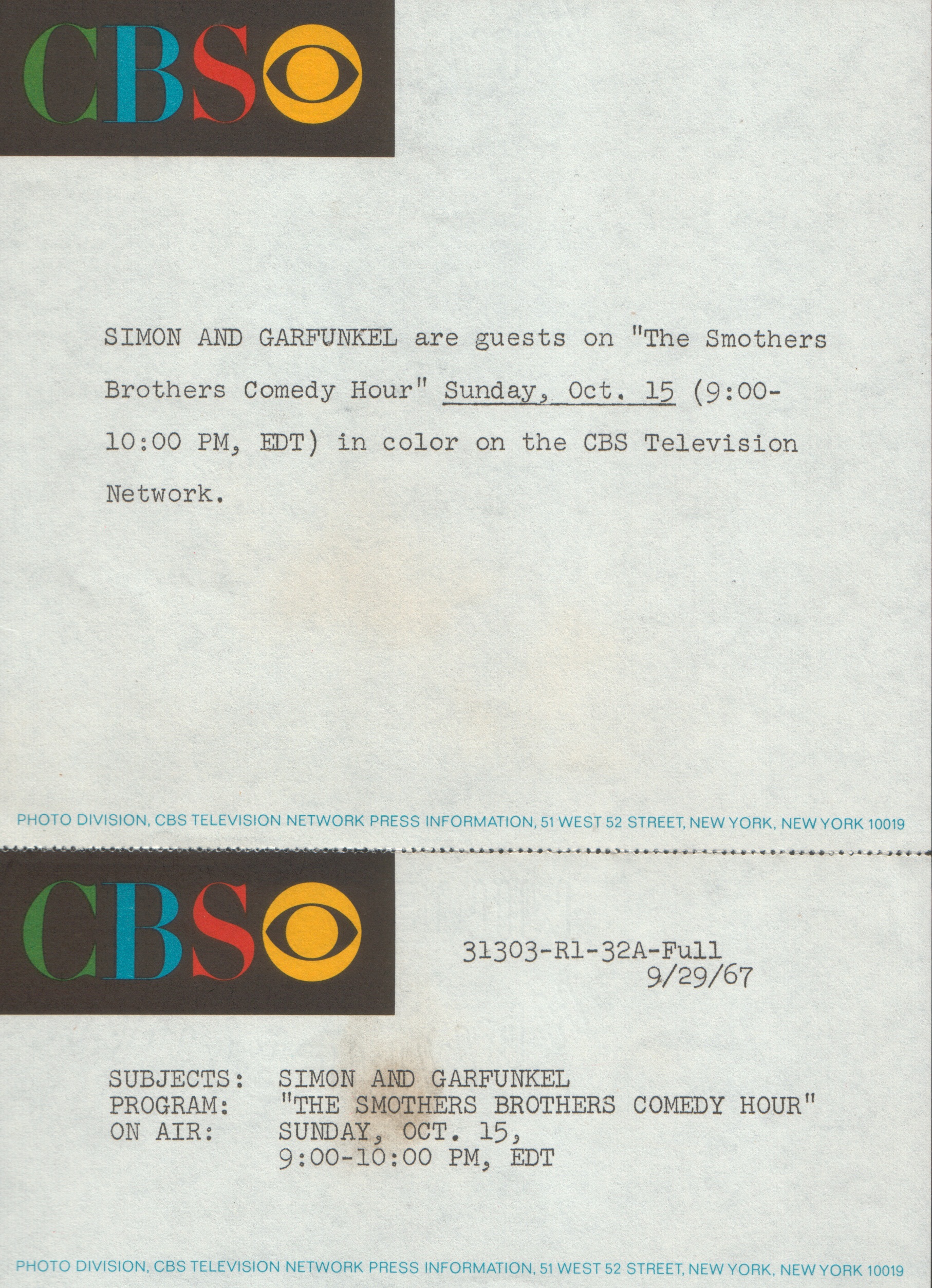 In 1967 Simon & Garfunkel appeared twice in the CBS Smother Brothers Comedy Hour Show: