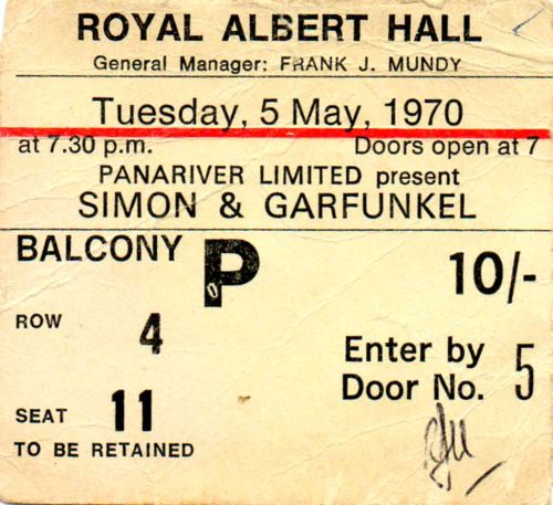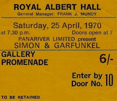 - Simon & Garfunkel played twice (April and May) in the Royal Albert Hall. The 2 concerts were sold out in within hours. And many people were very ‘unlucky’ not being able to attend the events. Promotor Tito Burns even received ‘two letters threatening me with violence unless I send them tickets, and I am sure a lot of tickets must be on the black market now’, he told DISC-magazine in 1970. No recordings were made by BBC Radio.